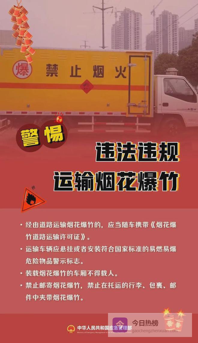 3. 禁止携带烟花爆竹搭乘公共交通工具禁止邮寄烟花爆竹,禁止在托运的行李包裹、邮件中夹带烟花爆竹。