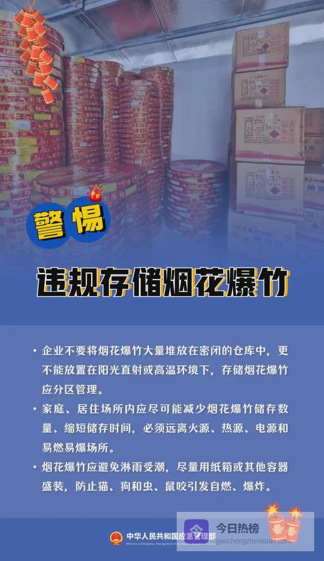 3. 家庭、居住场所内应尽可能减少烟花爆竹储存数量、缩短储存时间,必须远离火源、热源、电源和易燃易爆场所。