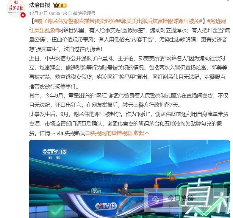 央视新闻频道最近报道里,谢孟伟又一次被提到了。报道里不仅说他穿警服直播时“无视法律、大放厥词”,还直接证实了他直播间卖的是假酒。