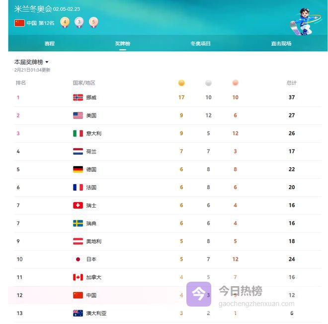 “金牌夫妇”为中国代表团新增2枚金牌,截至2月21日凌晨最新奖牌榜显示,中国代表团以4金3银5铜、总计12枚奖牌暂列第12位,较此前排名稳步提升。两人的金牌让中国队巩固了亚洲阵营优势,拉开与韩国队(2金2银3铜)的差距,逼近前十行列。