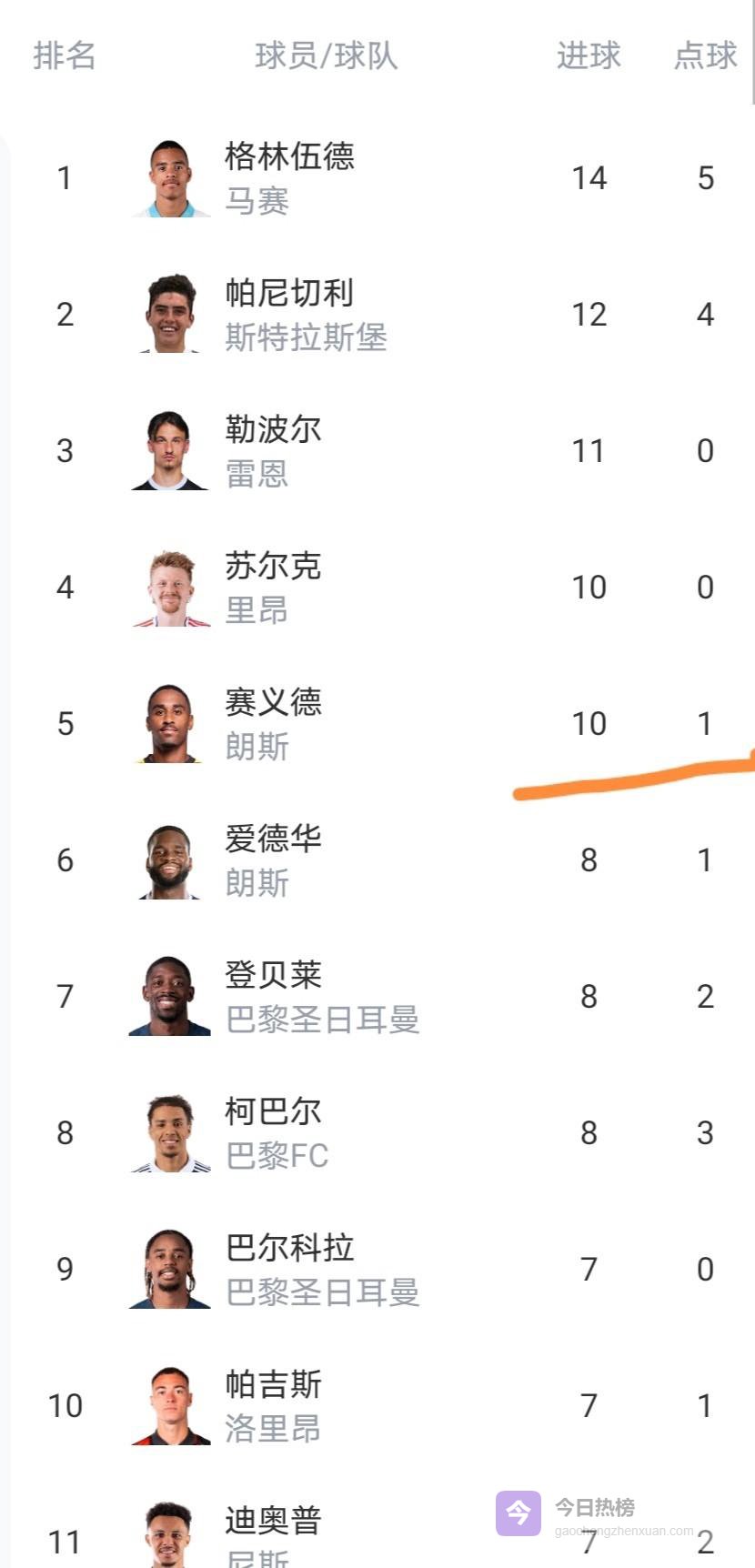说完积分榜,还得提一下射手榜。 目前法甲有5个人的联赛进球数都达到了两位数,竞争挺激烈。