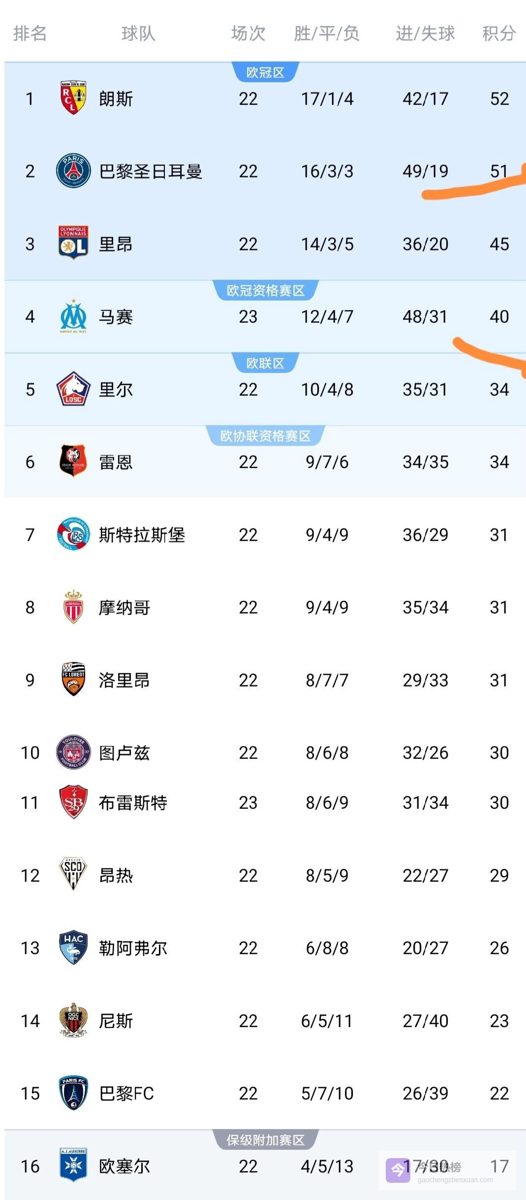 我们再看看积分榜最前面。 朗斯队现在以52分坐在榜首的位置上,巴黎圣日耳曼队以51分紧紧跟在后面,两队只差1分。 这争冠的戏码,真是咬得死死的。 里昂队积45分排在第三,距离榜首的朗斯有7分的差距。