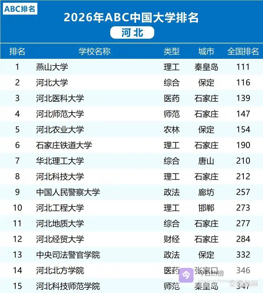 2026年ABC中国大学排名近日出炉,河北省高校表现如何?这份榜单背后,隐藏着怎样的发展逻辑?当“双千计划”遇上“资产负债”新指标,河北高校的座次洗牌,究竟是实力的此消彼长,还是评价体系的多维透视?从秦皇岛到保定,从石家庄到唐山,15强高校的位次变化,折射出河北高等教育怎样的真实生态?今天,我们就来拆解这份榜单,看看数据背后的高校进化论。