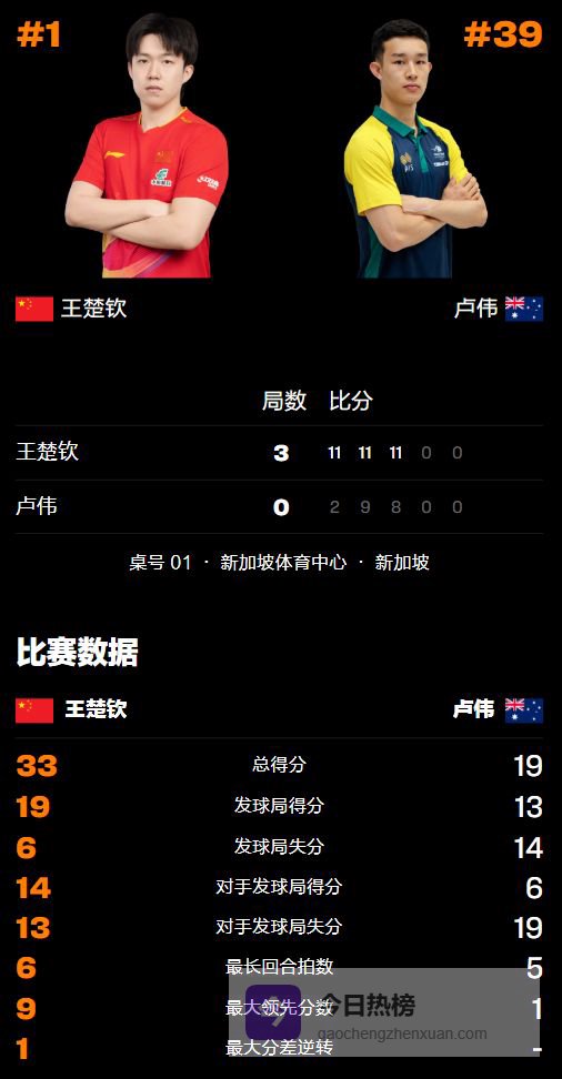 2026年2月22日晚,国乒结束WTT新加坡大满贯赛正赛首日的最后一战,男单头号种子王楚钦狂轰3-0横扫澳大利亚选手卢伟,由此而为中国队赢得本站比赛的第6场胜利,接下来将在32强赛中与日本世界冠军户上隼辅过招,不过国乒目前也有2位选手出局止步单打首轮,有人欢喜有人愁——更多详情请看下文。
