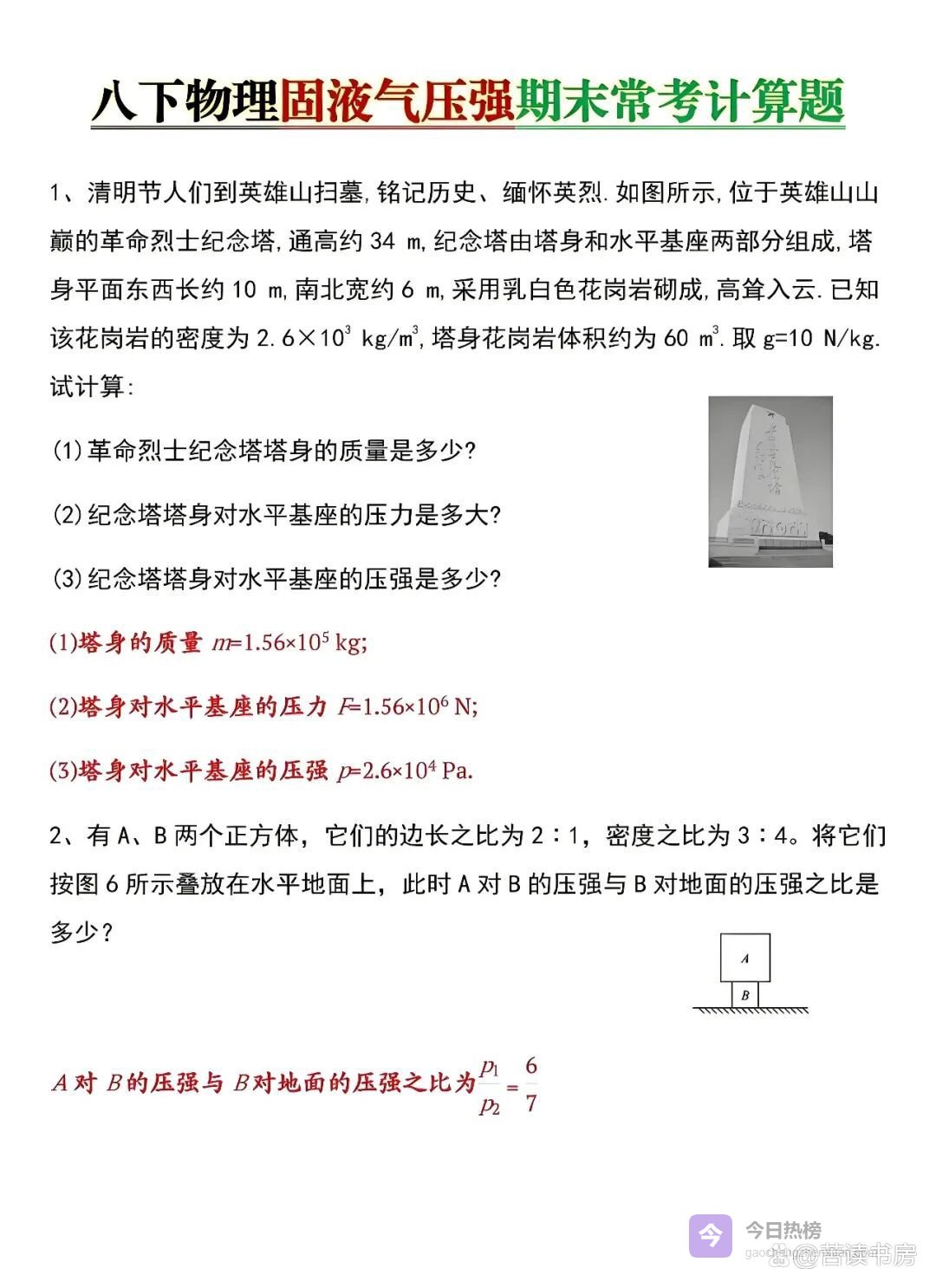 其实压强并不难,它公式固定、思路清晰、题型稳定,只要找准方法、集中训练、规范步骤,就能从“一做就错”变成“一做就对”。真正拉开孩子差距的,不是智商,而是是否在假期把最容易丢分的计算题提前练熟、练透、练到位。