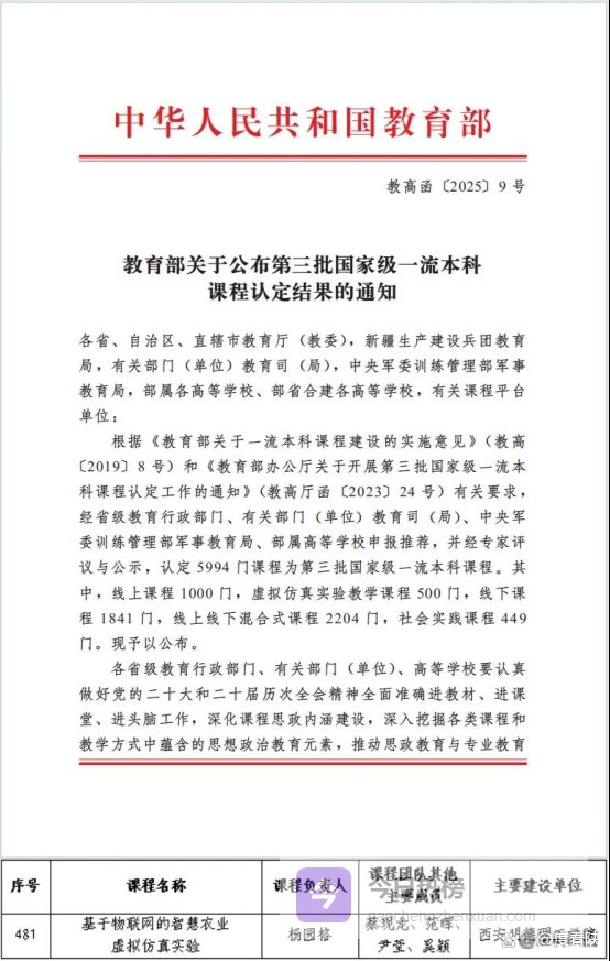 近日,教育部发布《关于公布第三批国家级一流本科课程认定结果的通知》(教高函〔2025〕9号),学校申报《基于物联网的智慧农业虚拟仿真实验》课程成功入选第三批国家级一流本科课程(虚拟仿真实验教学一流课程)。