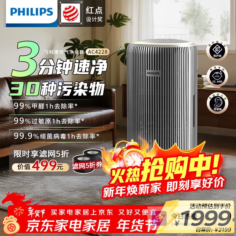 【京东自营】飞利浦空气净化器除甲醛神器新房急入住鼻炎专业家用宠物净化机除烟味病毒过敏原螨尘AC422¥