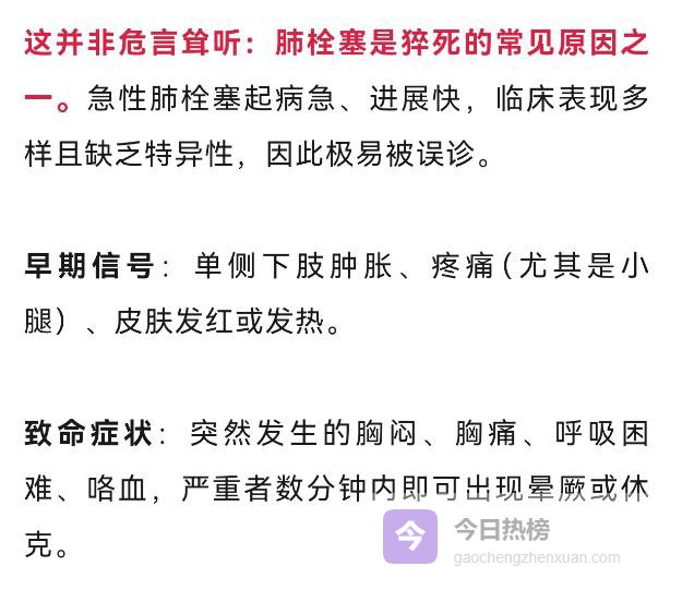 杭州市中医院危重病医学中心主任的张美齐主任提醒:久坐不动+缺水,是血栓的“温床”。很多人以为肺栓塞是老年病,其实不然。
