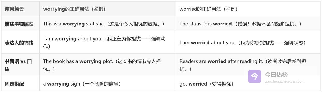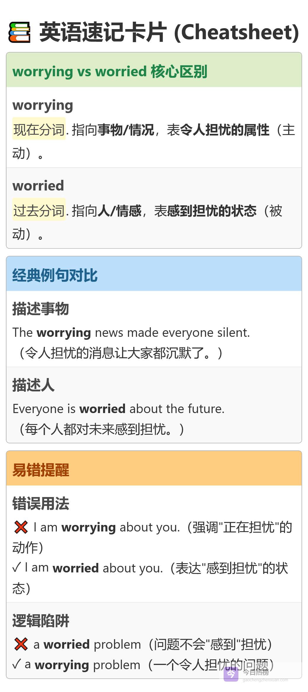 所以啊,下次再看到worrying和worried,别犯迷糊了——记住这个口诀:事 worrying,人 worried;事管属性,人管状态。英语里的这些小细节,看似麻烦,其实是在帮我们把意思说得明明白白,避免误会。多读多用,慢慢就形成语感了,到时候你也能脱口而出地地道道的英语!