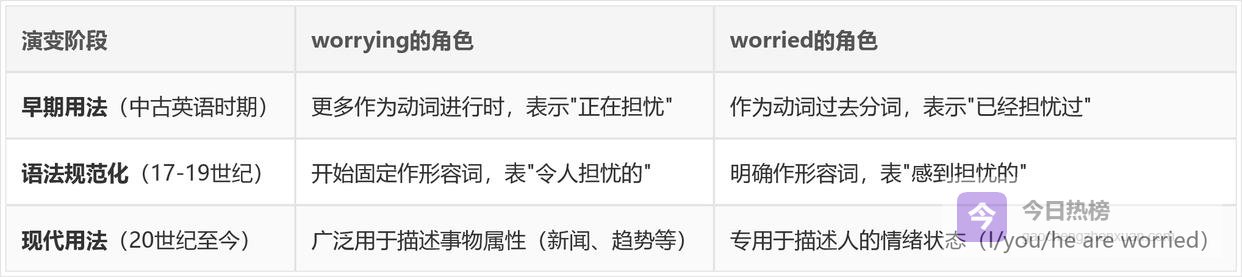 再说说历史惯例。英语这玩意儿,不是谁拍脑袋定规矩的,是老祖宗用着用着,慢慢就形成习惯了。worry这个词,最早可能来自荷兰语"worien",意思大概是"扼住喉咙",后来引申为"焦虑、烦恼"。在语法发展过程中,"-ing"分词逐渐承担起描述"具有某种特性的事物"的功能,比如"interesting"(有趣的)、"boring"(无聊的);而"-ed"分词则专攻描述"处于某种状态的人或物",比如"interested"(感兴趣的)、"bored"(无聊的)。worrying和worried也乖乖遵循了这个"潜规则"——前者当"形容事物",后者当"形容人",时间一长,就成了铁律,大家说到这儿,脑子里自动就切换过来了。
