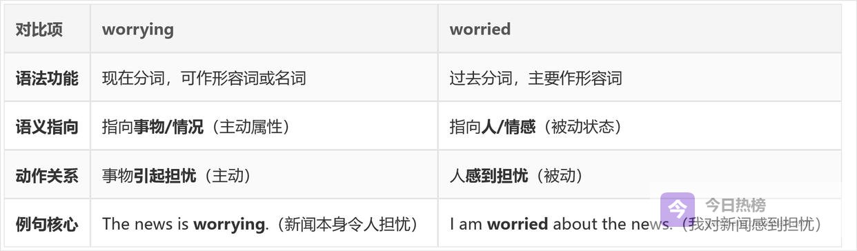 你有没有过这样的经历:看着英语句子,明明每个词都认识,但组合在一起就让人犯迷糊?比如"a worrying situation"和"I am worried",这两个"worry"的变形,到底有啥不一样?为啥一个说"令人担忧的",另一个说"感到担忧的"?别急,今天咱们就掰开了揉碎了,聊聊这对"双胞胎兄弟"的秘密——说白了,就是语法分工和语义习惯在捣鬼!