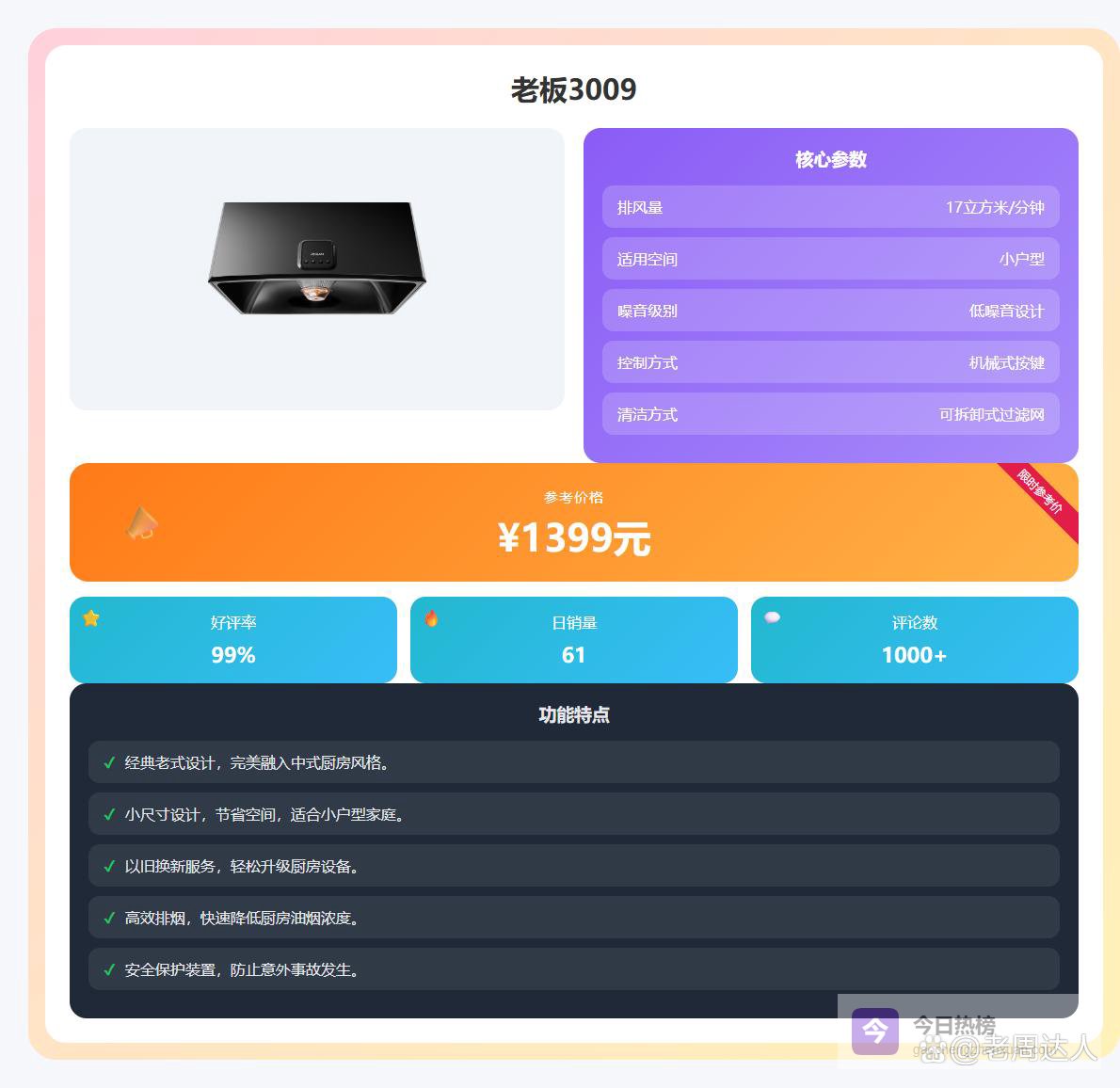 说起高端厨电,老板电器绝对是国产里的金字招牌。但名气大也带来选择困难,它家油烟机型号众多,设计各异,价格从两千到近四千都有。光看商品页,都说自己吸力强、易清洁。“老板油烟机哪款好”这个问题,真不能一概而论。作为一个经常下厨、对油烟零容忍的用户,我深入研究了老板几款主流型号。今天,我们就抛开笼统的参数,从最关乎实际效果的“吸烟腔体设计”、“核心风压与排烟能力”以及“内部清洁技术”这三个硬核维度,帮你分析这三款代表型号,看看哪一款的设计最能“对症下药”,解决你厨房的油烟难题。