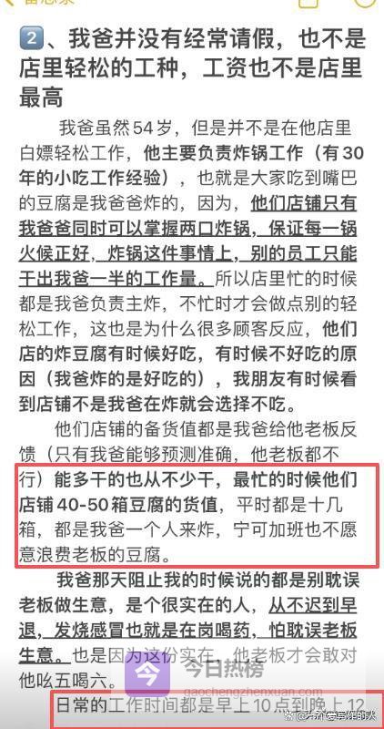 故事的主角是一位54岁的老员工,在这家臭豆腐店勤勤恳恳干了多年,是店里公认的“老黄牛”。春节期间别人阖家团圆,他却从大年初一就守在油锅旁,每天从早上九点干到凌晨一点,高强度工作连轴转,整个春节只休息了除夕一天。就连家人生病住院,他都尽量克服,能不请假就不请假,实在没办法也是请最短的假,处理完家事立刻赶回店里。
