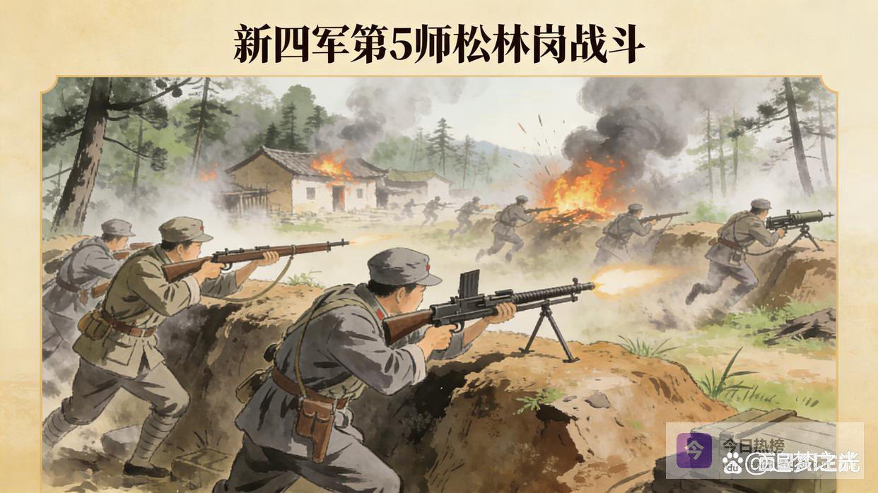 松林岗地势险要,岗岭连绵,松林密布,荆棘丛生,是易守难攻的天然屏障。驻守此地的是新四军第5师13旅37团2营,面对数倍于己的敌人,战士们没有丝毫畏惧。营长临阵部署:利用松林的掩护,构筑简易工事,以火力点封锁要道,采取“节节阻击、诱敌深入、聚而歼之”的战术,誓要守住这片阵地。