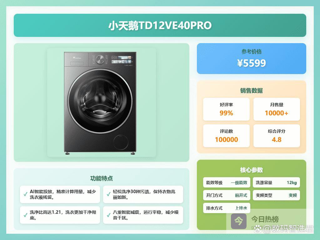 第2款:小天鹅小乌梅3.0轻享版小天鹅作为国内知名的家电品牌,在洗衣机领域深耕多年,积累了良好的用户口碑。它致力于通过技术创新,为消费者提供更加智能、便捷的洗衣体验。小天鹅洗衣机在外观设计上不断推陈出新,力求与现代家居风格相融合。同时,小天鹅也注重产品的节能环保性能,在提供高效洗涤效果的同时,尽量降低能源消耗。小天鹅洗衣机在性能、设计和环保方面都表现不错,是个值得考虑的品牌。