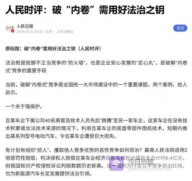 日前,央媒《人民日报》发布了一篇名为《破“内卷”需用好法治之钥》,其中就提到了,吉某车企下属公司40名高管和技术人员,先后跳槽到另一家车企,这家车企在没有技术积累和合法技术来源的情况下,利用吉某车企的底盘零部件图纸和技术,短期内推出了某系列型号电动汽车,令吉某车企遭受了巨大损失,最终吉某车企获赔6.4亿元巨额赔偿。