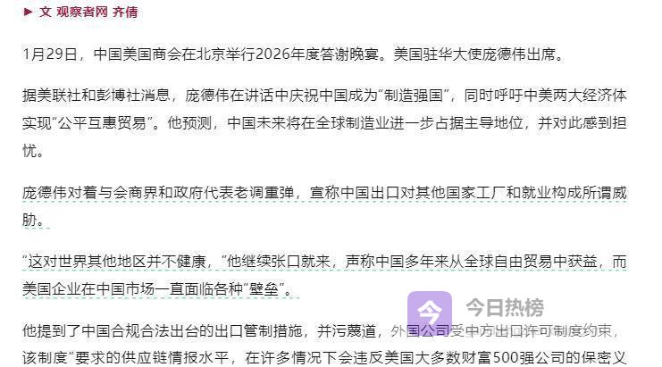 指责中国在工业发展方面取得了显著成就,但认为其不应限制出口,声称中国的做法存在违规之处。