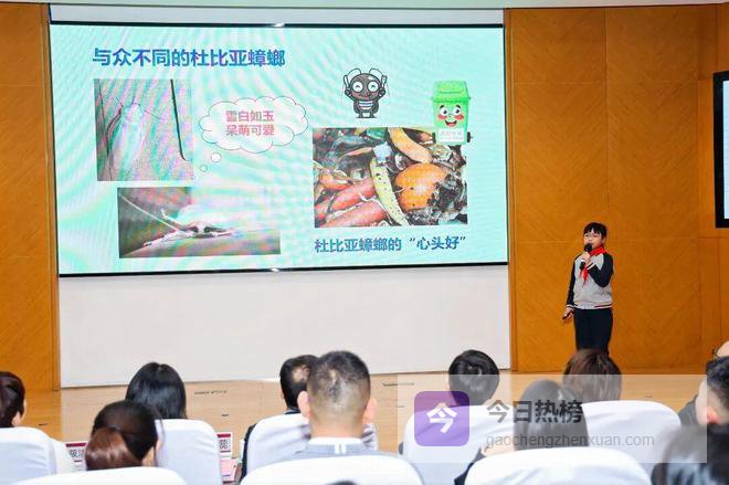 来自红旗小学的郑馨悦,作为“小小公民科学家”称号获得者,在现场分享了自己对蟑螂的探究成果:“杜比亚蟑螂可以帮助我们消灭厨余垃圾。”
