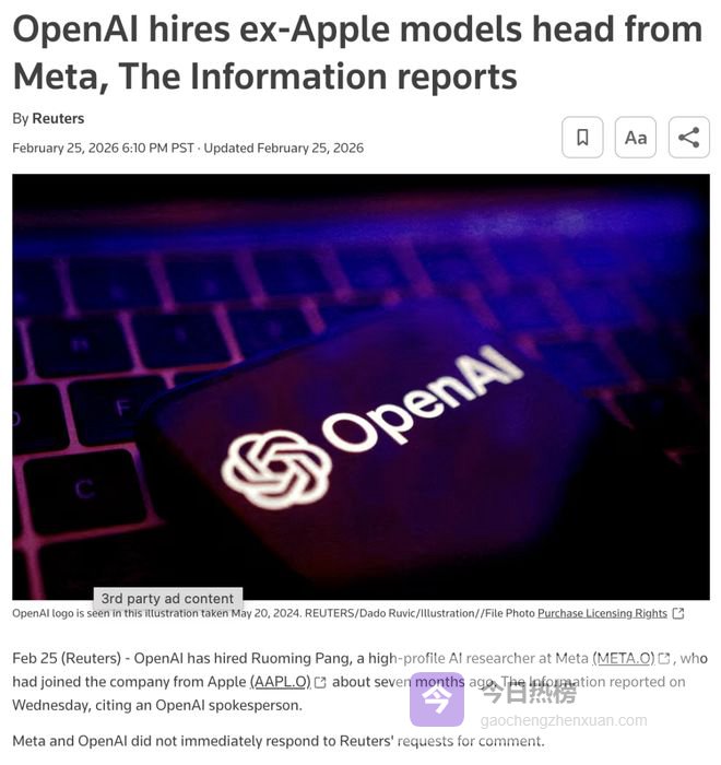 然而,即便面对如此天文数字,庞若鸣在Meta仅仅待了七个月,便在OpenAI长达数月的“强势追求”下,头也不回地离去。在过去12个月里,他完成了从苹果到Meta、再到OpenAI的惊人三连跳。