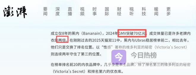 与此同时,以Ubras、内外、蕉内为代表的本土品牌,精准抓住了这一消费趋势,凭借无钢圈、零束缚的产品理念迅速崛起,其中当属蕉内和Ubras的成绩最为突出,2024年成立仅八年的蕉内GMV便突破了70亿元,成交体量一度达到许多老牌内衣的两倍。