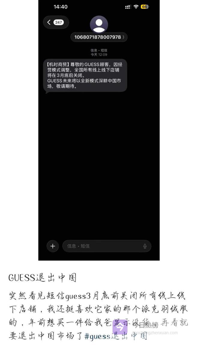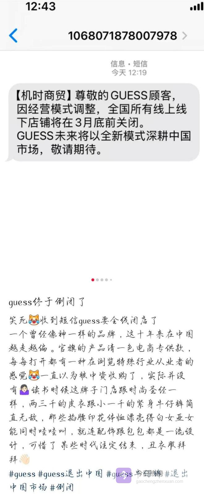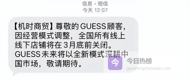 二月末,一条短信悄然出现在许多消费者的手机里,发件人是GUESS,内容很简单,因经营模式调整,品牌将于3月底前关闭全国所有线上及线下店铺。