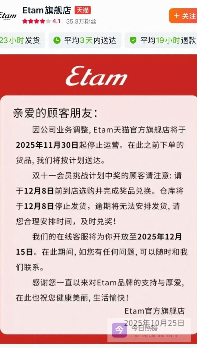 几乎同一时间,法国服饰品牌Etam艾格的天猫旗舰店停止运营,其小红书、抖音店铺也同步关闭。
