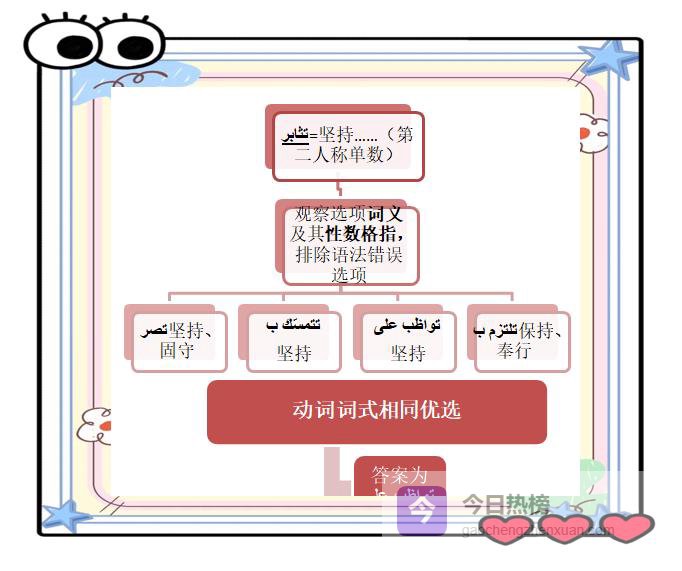 2.1 > 词式优先——原词词式就是“红旗”当五个选项词义都“差不多”时,直接看词式。阿拉伯语动词的词式(ميّز)就像身份证,一旦与原题动词词式对不上,直接排除。