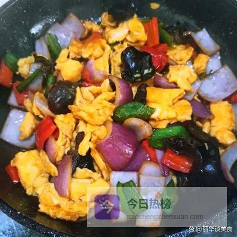 第一道,洋葱木耳炒鸡蛋。这道菜色彩分明,营养搭配也合理。泡发好的黑木耳洗净撕成小朵,洋葱切丝,再打上几个鸡蛋。锅里油热后,先把鸡蛋炒成块盛出。再用底油爆香蒜末,下洋葱丝炒到微微透明,散发出甜香,然后倒入木耳快速翻炒。木耳在热锅里会噼啪作响,这是水分在蒸发,口感会变得更脆。最后把炒好的鸡蛋倒回锅里,加盐、少许生抽调味,翻炒均匀就可以出锅了。鸡蛋的嫩滑,木耳的脆爽,洋葱的清甜,融合在一起特别下饭。鸡蛋提供优质蛋白,洋葱富含槲皮素也有抗氧化作用,和木耳搭配,养颜效果加倍。
