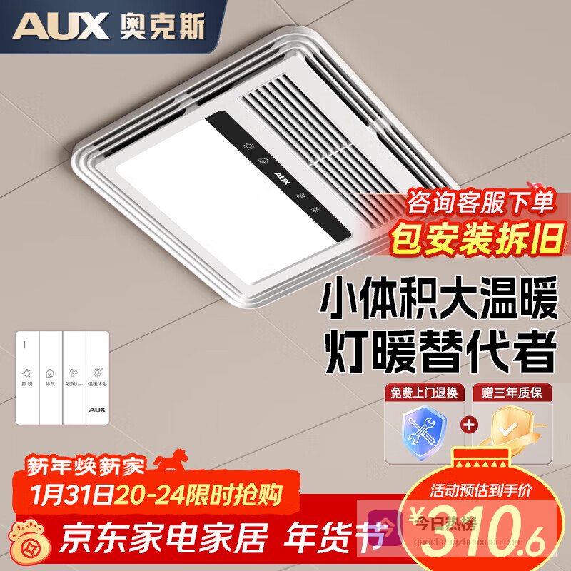 【品牌直营】奥克斯变频风暖浴霸灯暖照明排气一体集成吊顶300x600卫生间浴室暖风机【AI恒温|包安¥