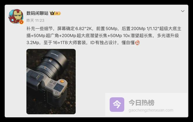 据说影像它可能配备哈苏加持的2亿像素超清主摄,加上5000万超广角和5000万潜望长焦,甚至还有一颗“丹霞原色镜头” 。