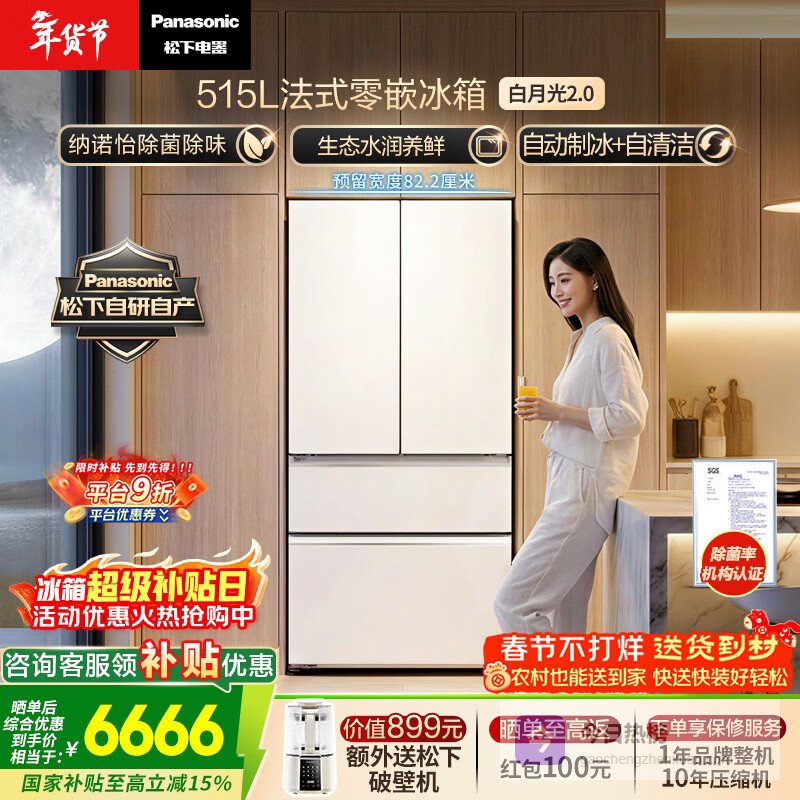 【京东自营】松下白月光2.0515L法式多门冰箱家用超薄零嵌入式自动制冰一级能效NR-ED52APB¥