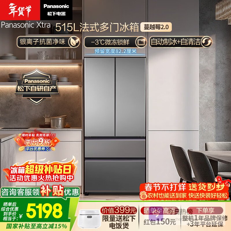 【京东自营】松下蔓越莓2.0515L法式多门冰箱家用零嵌入式风冷无霜自动制冰一级能效NR-XG52G¥