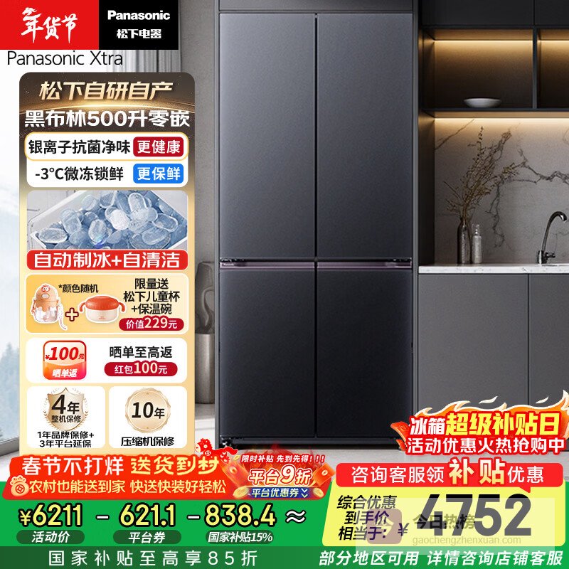 【京东自营】松下Xtra蔓越莓2.0十字门500L冰箱四开门家用超薄零嵌入自动制冰一级能效NR-XD¥