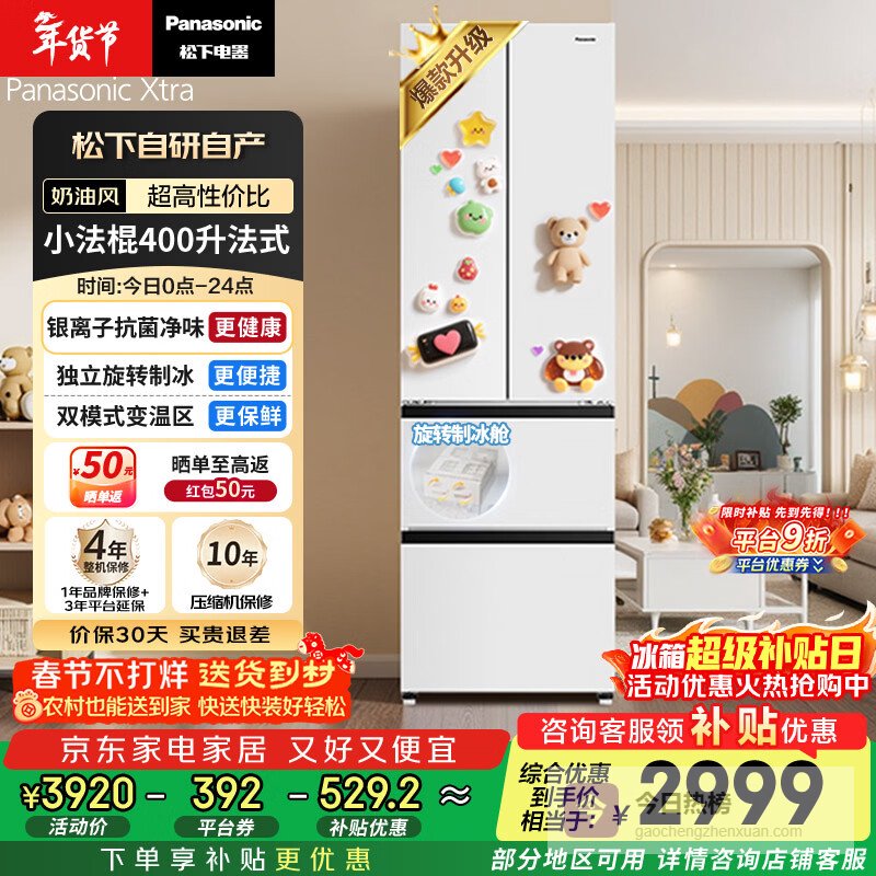 【京东自营】松下Xtra小法棍400L法式多门冰箱家用小户型超薄风冷无霜以旧换新璀璨白NR-XG41¥
