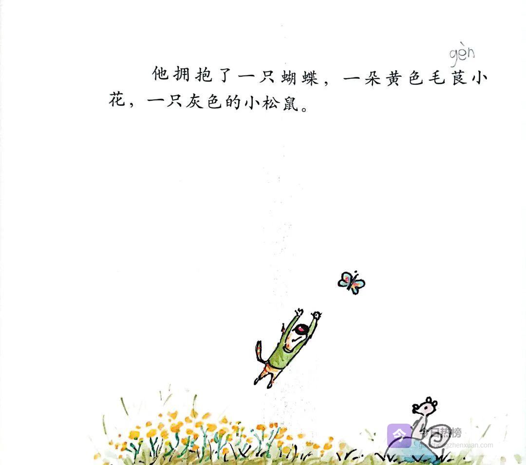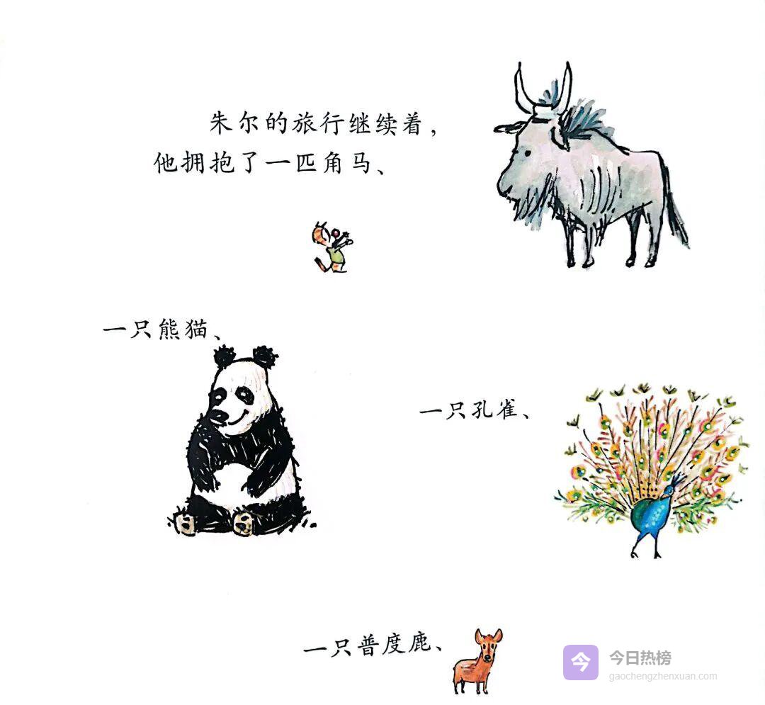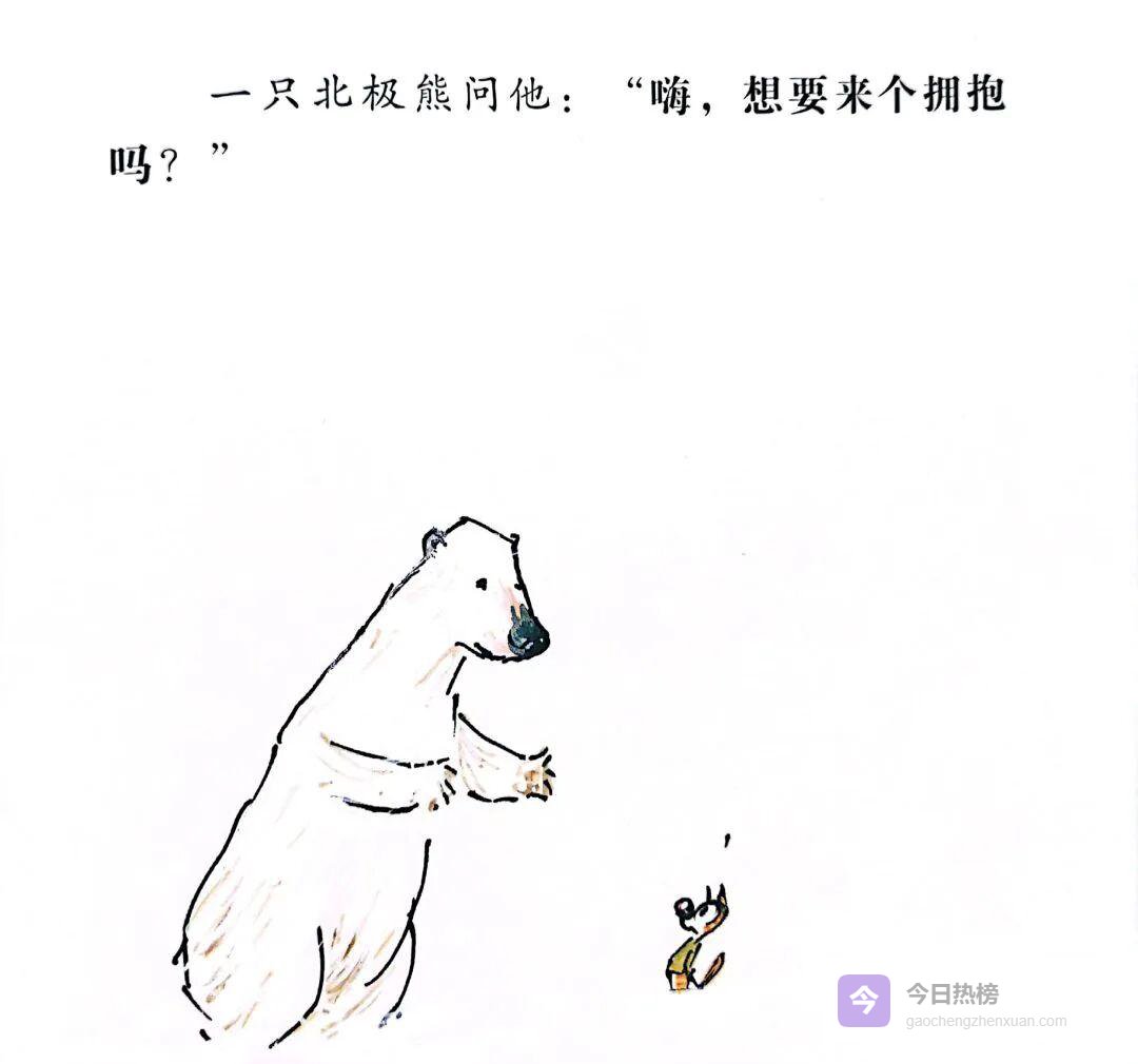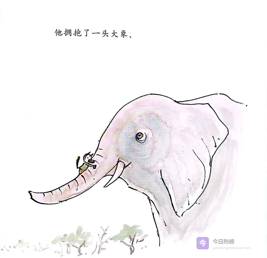 他列了一张长长的名单:先抱朋友,再抱蝴蝶、黄花、松鼠;他穿越雨林,把角马、熊猫、孔雀、沙袋鼠、热带鱼一一揽进怀里;他来到北极,发现名单上的动物一个都没有,正难过时,一只北极熊拍拍他的肩——
