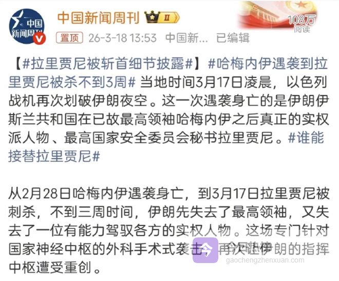 3月17日,以色列宣布炸死了拉里贾尼。