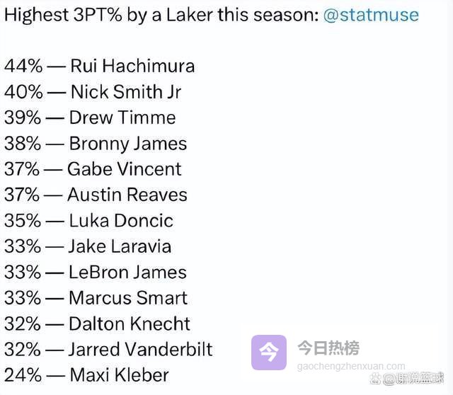 尼克-史密斯紧随其后,他因为是湖人双向球员,所以出场机会没那么多。即便如此尼克-史密斯还是数次成为奇兵,他赛季三分命中率超过4成,只是样本确实小一些。之后的提米和布朗尼-詹姆斯,三分命中率同样接近4成,只不过他们干脆是饮水机管理员了。文森特和里夫斯分列五六名,这两人倒算主要轮换,尤其里夫斯本赛季进步很大,已经朝着湖人三甚至二当家方向发展。