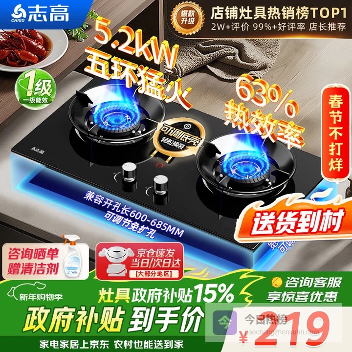 志高(CHIGO)燃气灶天然气液化气灶煤气灶家用猛火5.2kw双灶一级能效节能省气灶具台嵌两用厨房免开孔 政府补贴 【特价款】 钢化玻璃面板+五环猛火+聚能环 瓶装液化气丨5.0kW¥