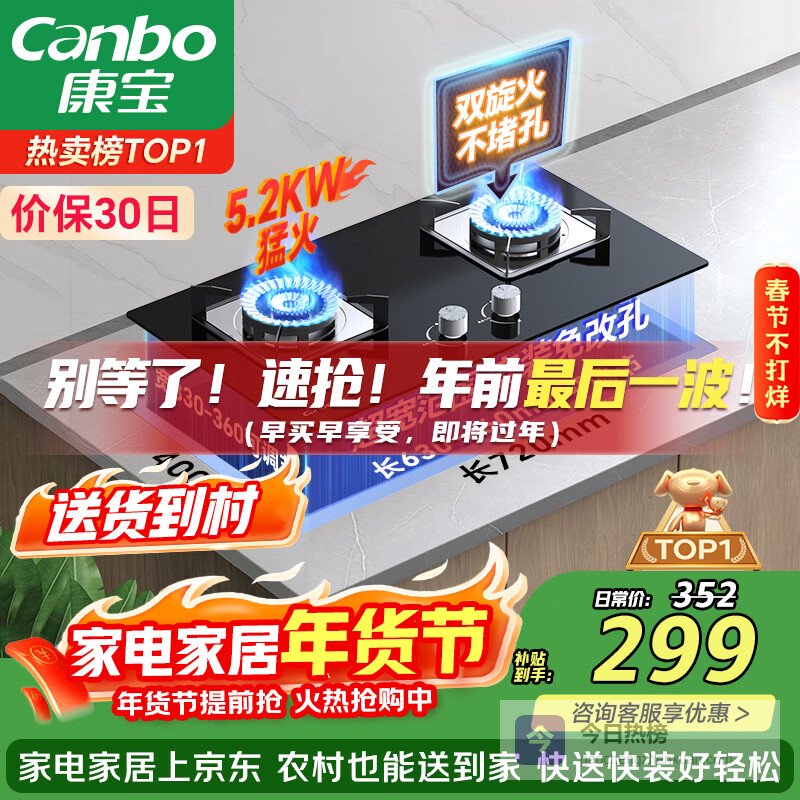 康宝(Canbo)燃气灶嵌入式天然气双灶具家用5.2KW猛火灶台炉具炉灶一级能效【政府补贴】JZT-2QB219¥
