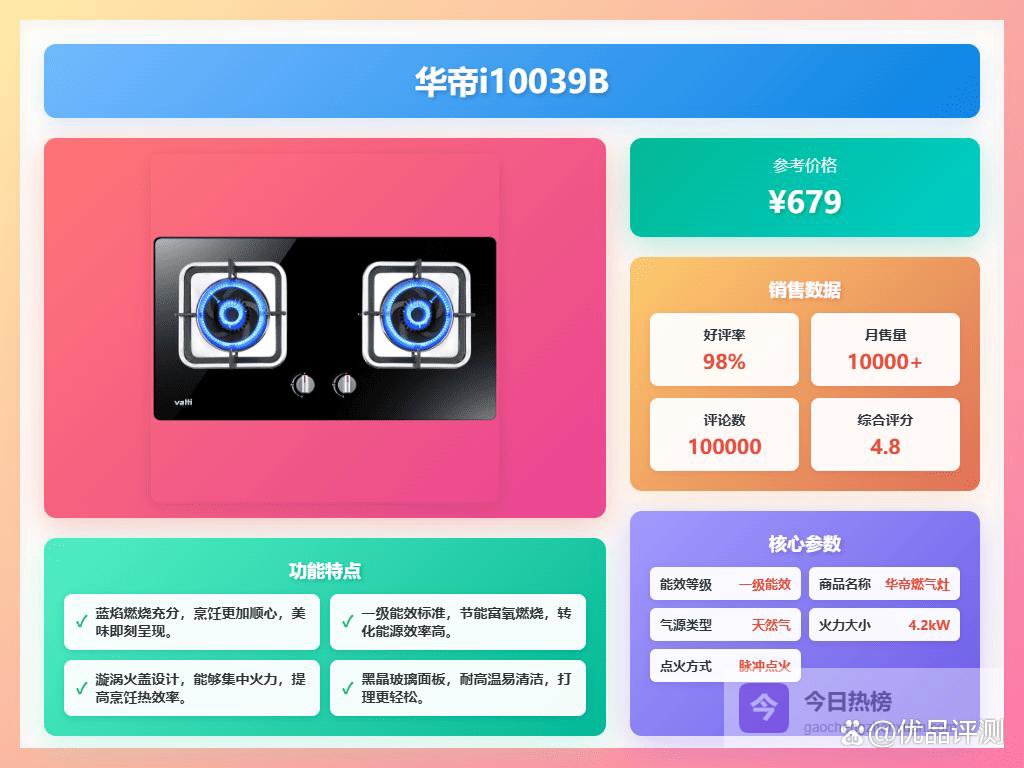 二、华帝这款华帝i10039B灶具配备了4.2kW的强劲火力,采用漩涡式火盖设计,能够将热量集中,确保爆炒、煮汤等多样烹饪都能高效完成。火力调节精准灵活,无论是需要大火快速翻炒,还是小火慢炖,都能满足不同需求,让烹饪变得更加得心应手。