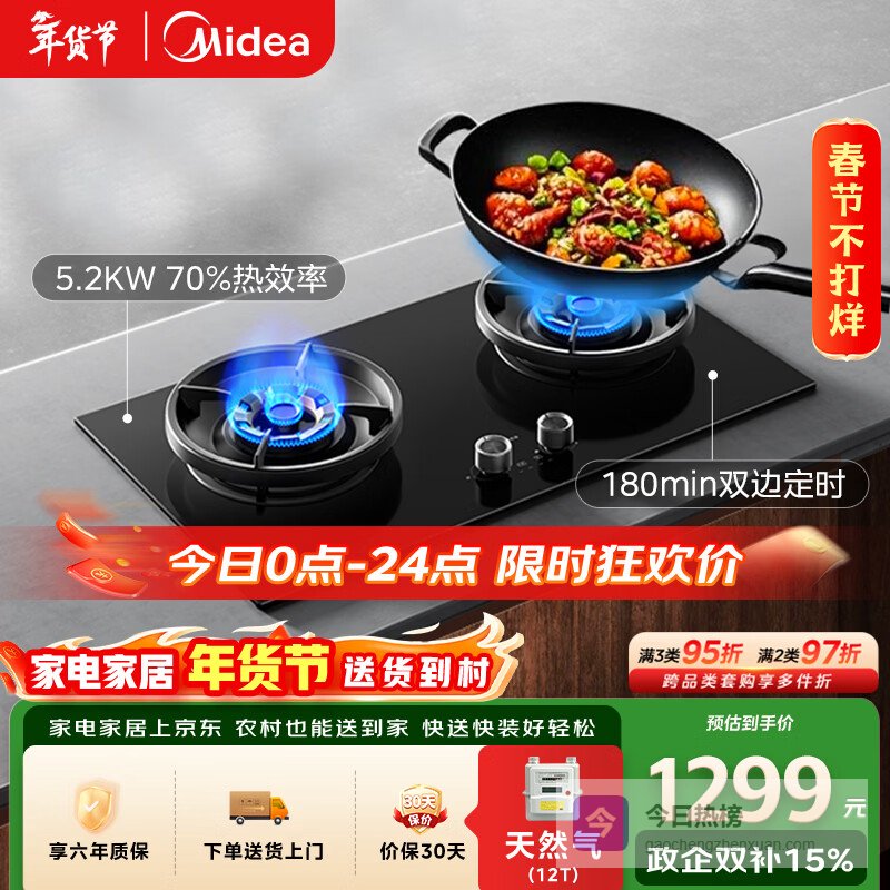 美的(Midea)【天然气】行业爆款家用5.2KW大火力燃气灶双边定时灶台嵌两用双灶搭配蒸汽洗系列灶JZT-QD529¥