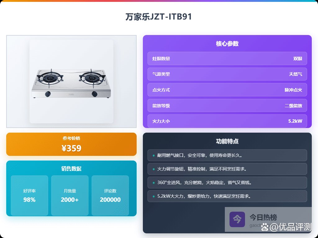 五、万家乐万家乐JZT-ITB91配备了5.2kW大火力火焰,能快速加热,特别适合中式爆炒。双灶设计让同时煮两个菜变得更加方便,厨房操作更高效。面板采用耐用的不锈钢材质,不仅美观,还能轻松清理,保持台面的整洁。