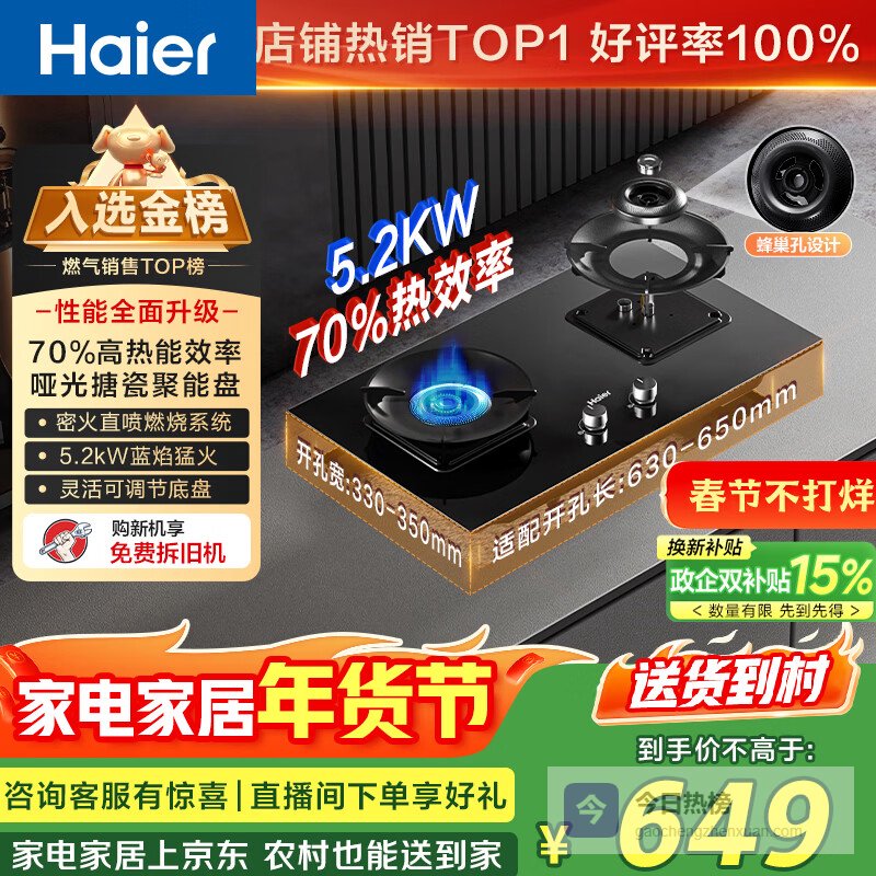 海尔(Haier)天然气燃气灶双灶 家用节能台嵌两用嵌入式煤气灶灶台 70%高热效5.2kw超密火 金榜推荐H70A可调节¥