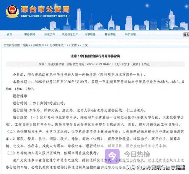 北京的出处是市政府发的《关于实施工作日高峰时段区域限行交通管理措施的通告》,挂在首都之窗这个门户网站上。天津那边是公安局发布的“安全防范提示”,交通信息和安全提醒绑在一起说。邢台则是市公安局发布的本地交通公告。