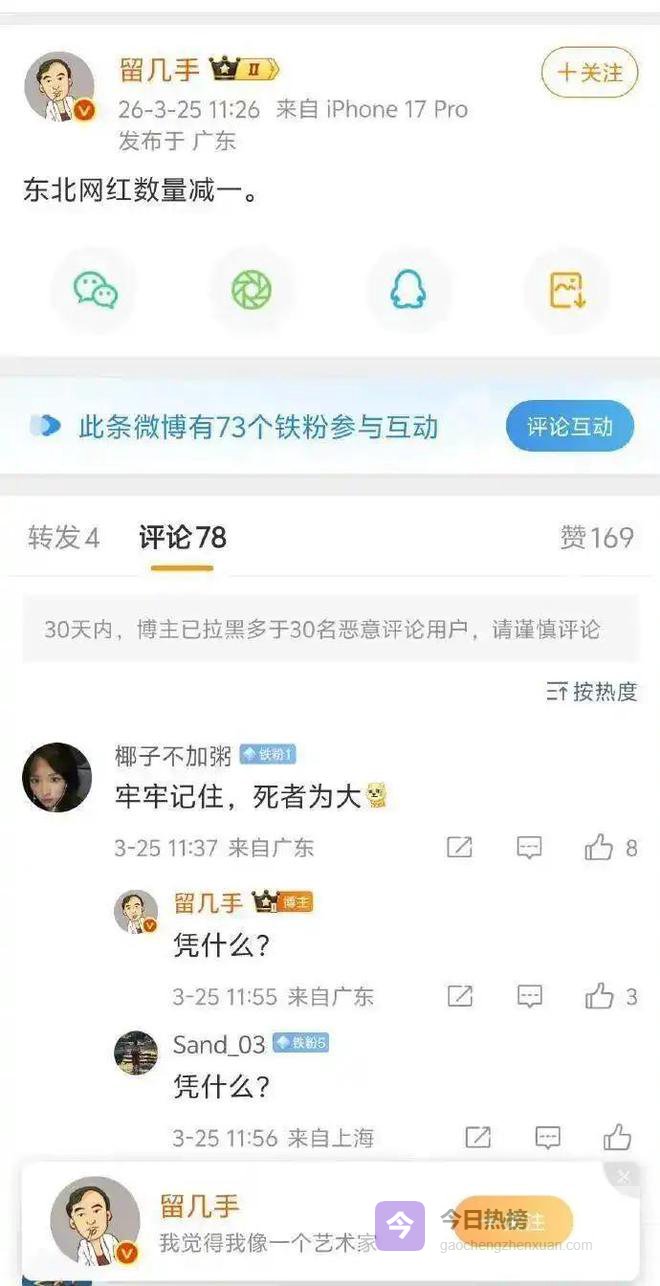 3月25日,“留几手”因在微博对教育名人张雪峰猝死事件发表争议言论引发众怒,他这条微博发文只有一句话——东北网红数量减一,被网友解读为影射张雪峰猝死事件。