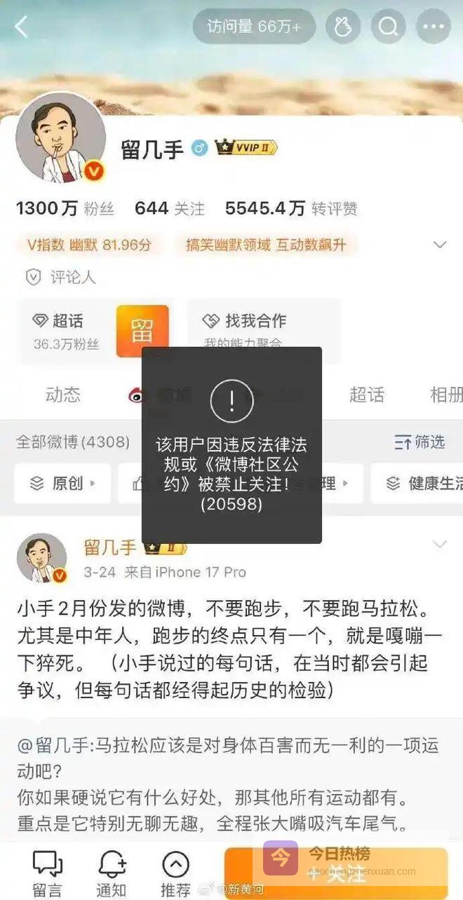 目前,该微博已被删除,其最近的一条微博为3月24日晚所发:“小手2月份发的微博,不要跑步,不要跑马拉松。尤其是中年人,跑步的终点只有一个,就是嘎嘣一下猝死。