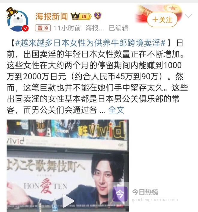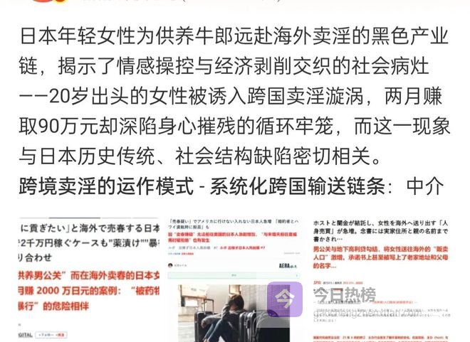 一件是日本自卫队年轻官员带长刀翻进别国驻日本使馆,当场被逮捕,日本官方也给出了让人惊掉下巴的初步调查结果。另一件是日本媒体自己挖出来的新闻,被国内媒体转发后传开,越来越多日本年轻女性靠出国挣快钱,赚的钱全砸在了本国牛郎身上。