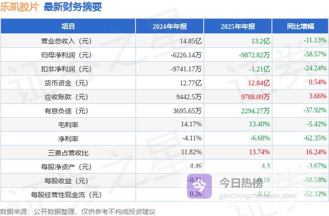 据证券之星公开数据整理,近期乐凯胶片(600135)发布2025年年报。根据财报显示,乐凯胶片净利润同比下降58.57%。截至本报告期末,公司营业总收入13.2亿元,同比下降11.13%,归母净利润-9872.82万元,同比下降58.57%。按单季度数据看,第四季度营业总收入3.6亿元,同比下降6.67%,第四季度归母净利润-1234.93万元,同比下降151.79%。