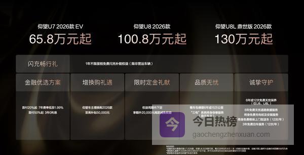 为了回馈首批用户,仰望汽车推出专属权益,2026年5月11日前支付新车定金的用户,可享受一年内免费使用比亚迪闪充桩的权益,进一步降低用车成本,提升出行体验。