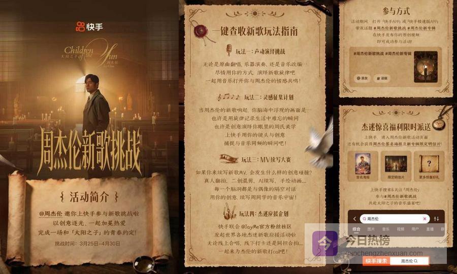 与此同时,快手还将联合JayMe官方粉丝社区发起“杰迷应援企划”,汇聚全球杰迷的力量,通过线上合唱、线下打卡、同担合拍等形式,共同为新歌打call。3月25日至4月30日,带双话题#周杰伦新歌挑战、#周杰伦新专辑 发布原创视频即可参与以上活动玩法,还有机会赢取周杰伦签名海报及新专辑限定明信片等惊喜福利。